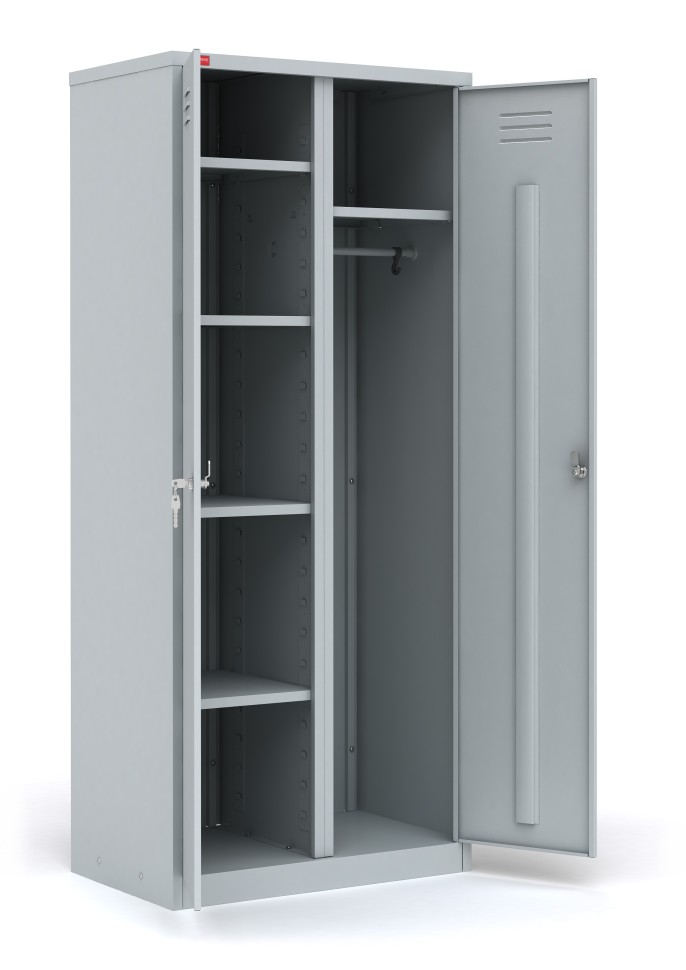 Шкаф металлический хозяйственный для хранения инвентаря, документов и одежды. Комплектуется полками и крючками для одежды.