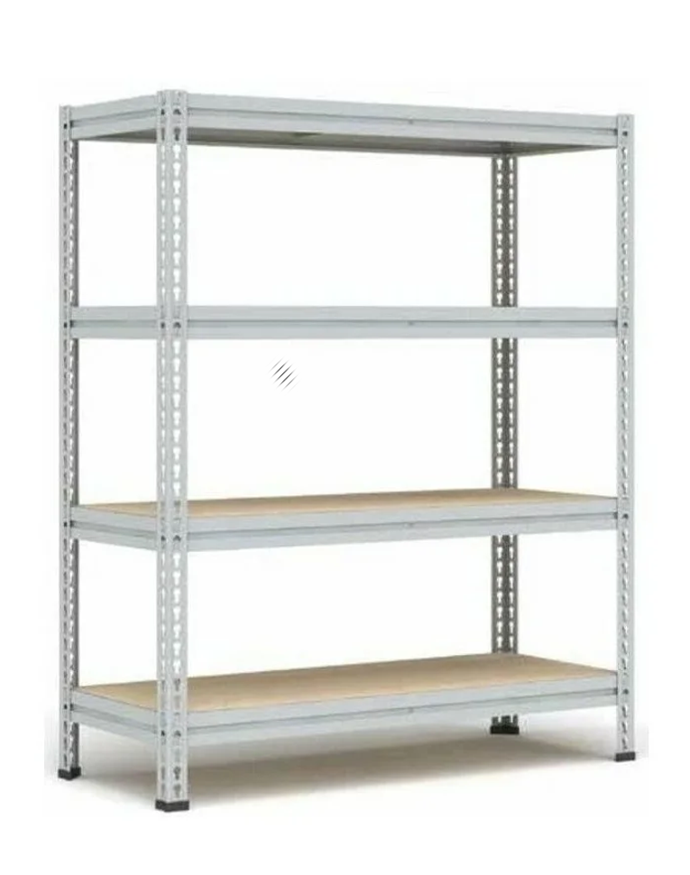 Металлический среднегрузовой стеллаж для склада с настилом из фанеры. Нагрузка на ярус до 300 кг. Быстросборная конструкция (на зацепах).